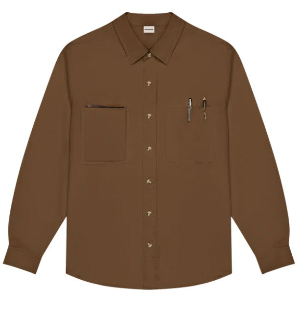 A structured long-sleeve shirt made from durable, wrinkle-resistant twill with tortoiseshell buttons. Features two oversized patch pockets for function and style.